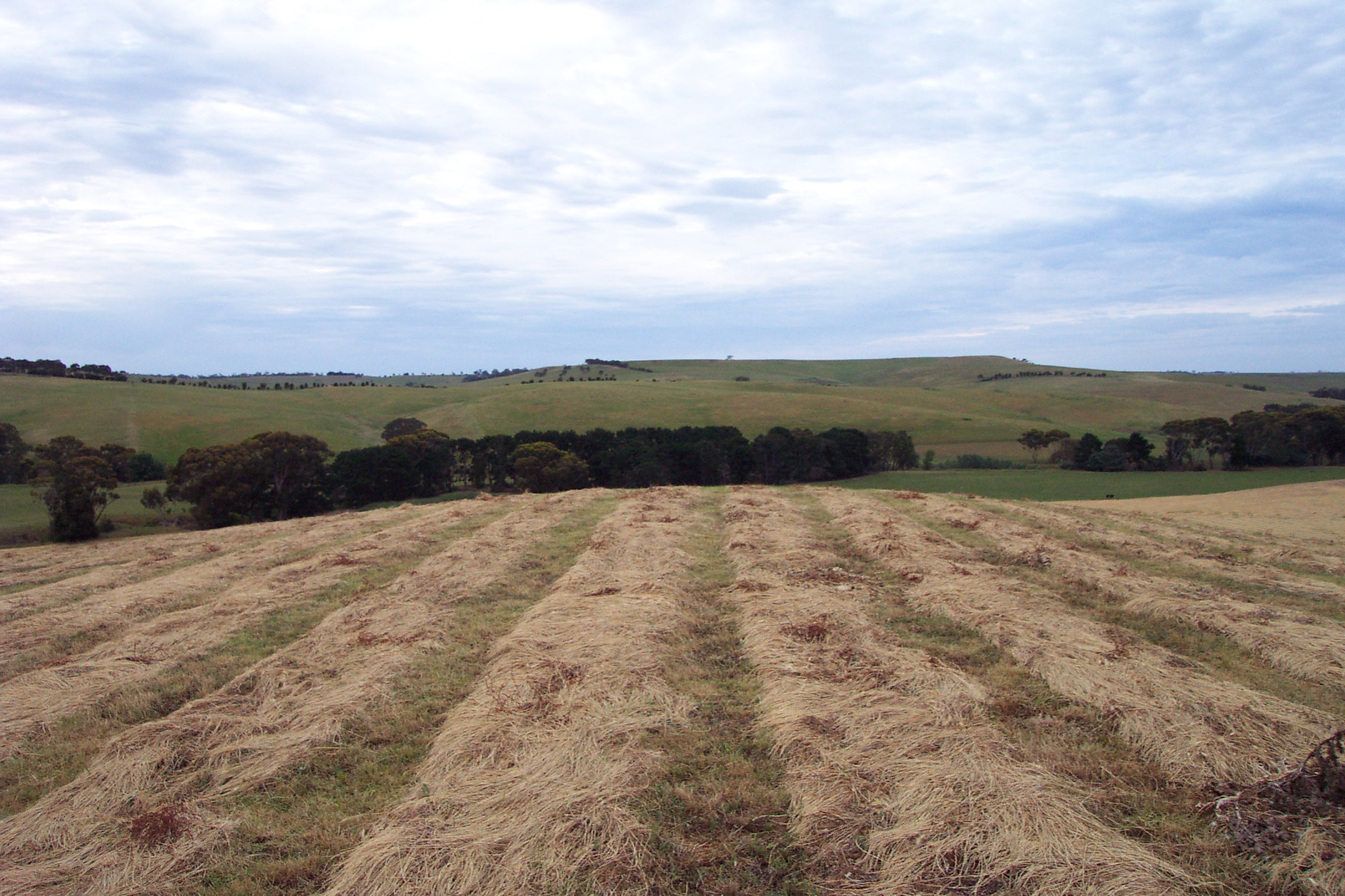 Most of the six week Christmas holidays was spent carting in hay. Jack wasn't a farmer and he always reckoned you had to get into a 'terrible bad mood' in order to begin hay carting. He seemed to build himself up mentally for the long sweltering summer ahead and then pressed on doggedly until the task was completed. First the hay was cut and bounded in sheaves by the harvester and then scattered in endless lines across the paddocks. The next job was to gather up ten or twenty sheaves into stooks to facilitate easy retrieval. Every new day we began work it was hard to see what we had accomplished on the previous day. Ballie built a frame over the large trailer and then we began the long task of carting in the sheaved hay and building a stack. These were far from easy to make and Ballie learnt the art from an old guy named Watty Moore. He must have been in his seventies when I saw him teach us how to build a oat sheaf hay stack. It was a work of art when he finished with the sides gradually slopping out and the top tappered to a line like a house roof. One false row with the sheaves facing the wrong way could result in whole sections of the stack slipping to an untidy mess on the ground.