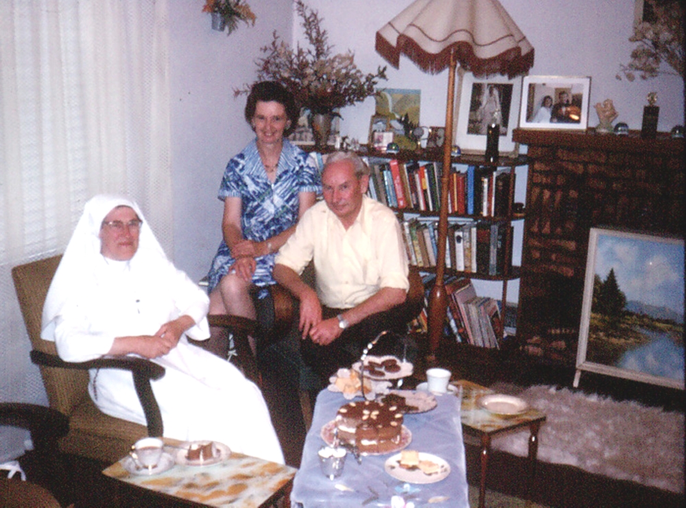 (Mum, Dad with a Sister of St. Joseph of Mary MacKillop's order who taught them in Coleraine. Mum's typical afternoon tea and her famous chocolate sponge cake)
