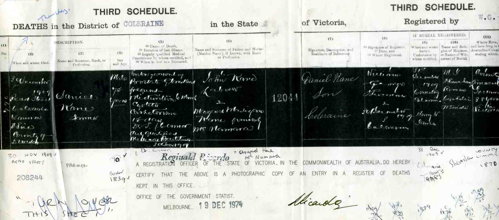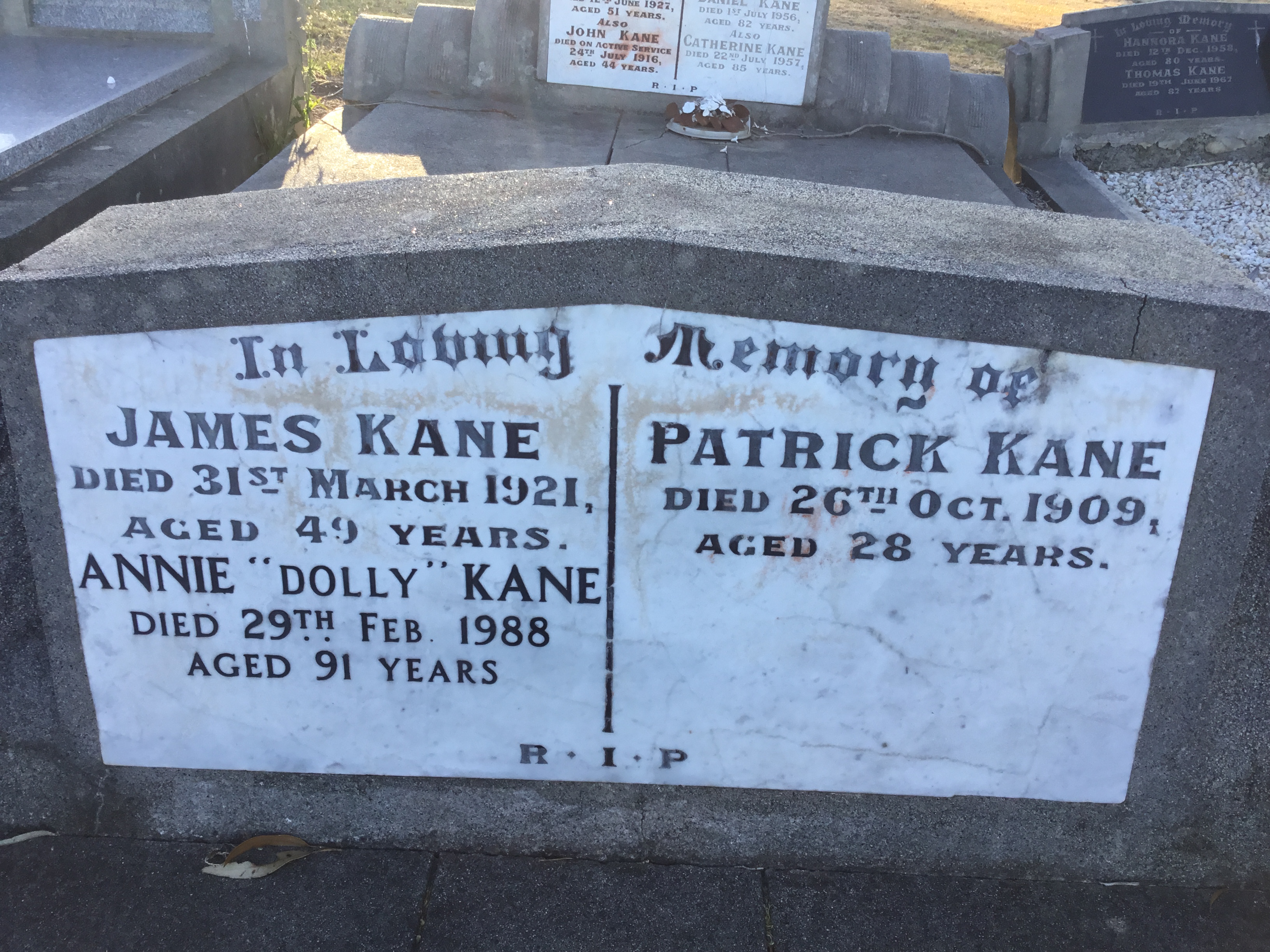| KANE | JAMES | Jim or Jas | Jan-26 | 1873 | Mar-31 | 1921 | 49 | Coleraine Victoria | ||||