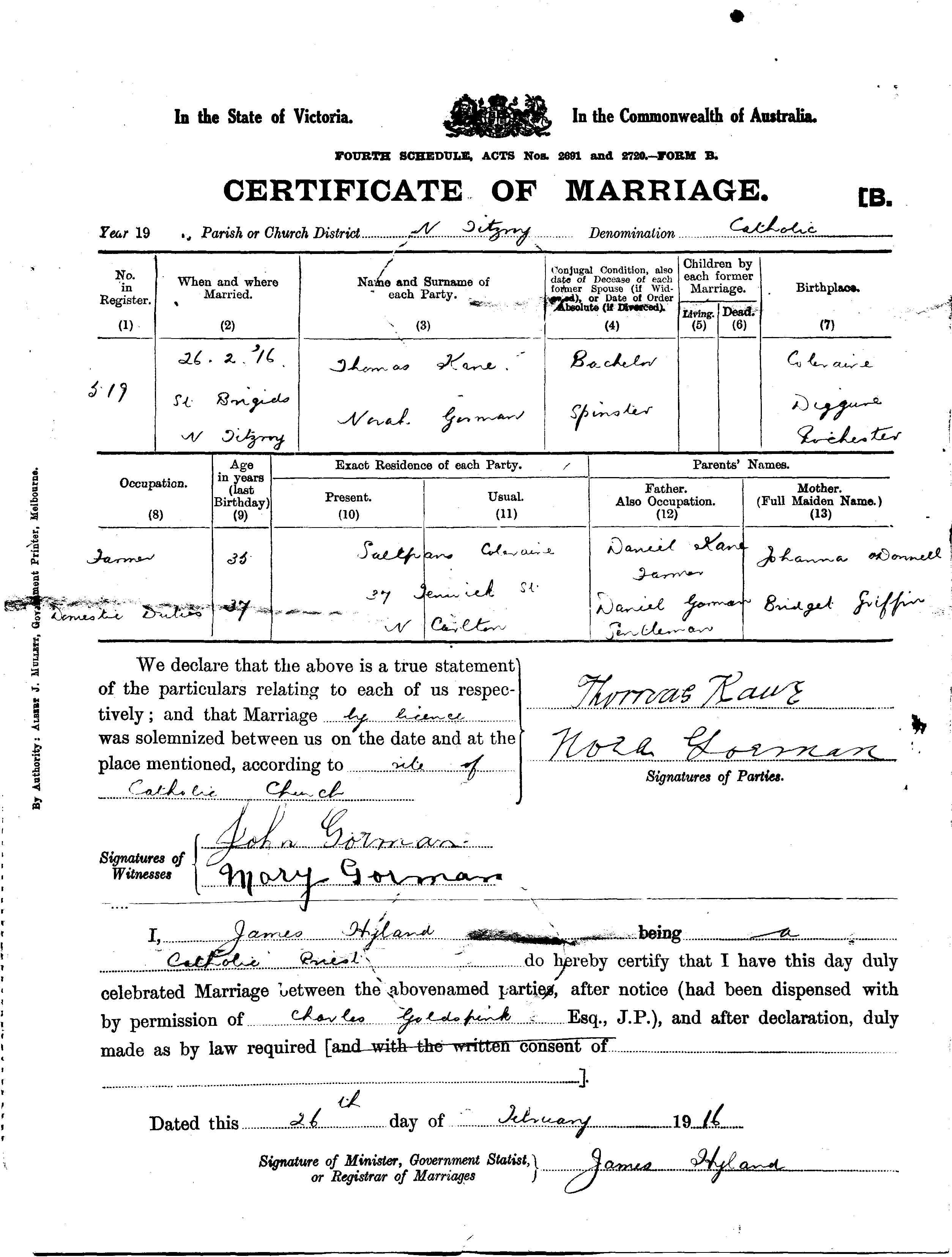 1882 | Nov 22 | 1933 | 82 | Coleraine Victoria | ||