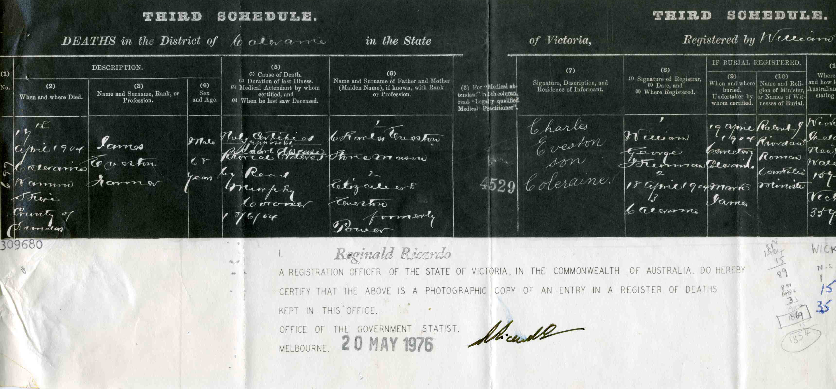 | EVESTON | JAMES | 1836 | Apr-17 | 1904 | 68 | Coleraine Victoria | ||||||
