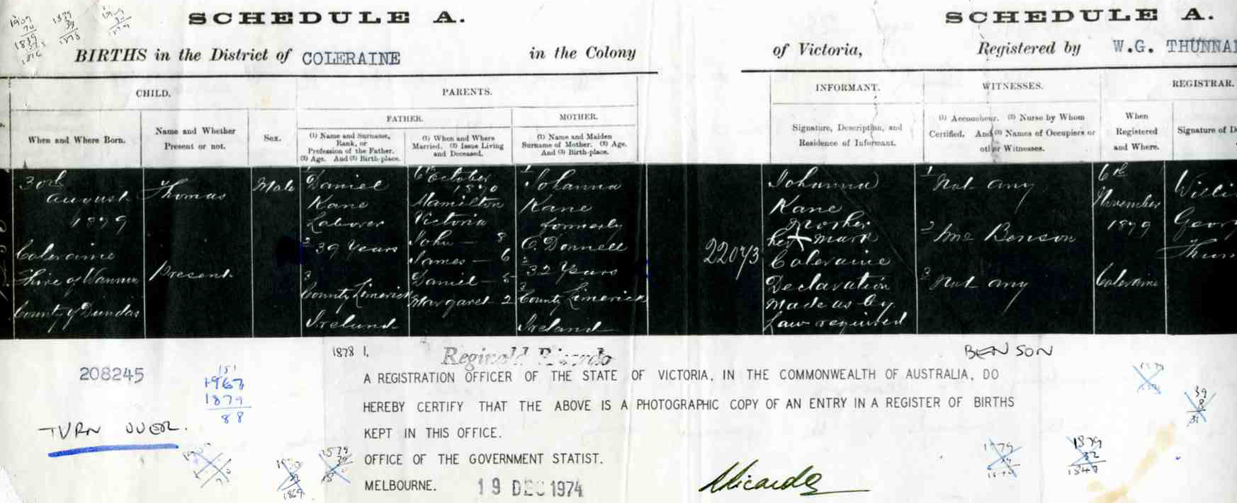 | KANE | PATRICK | Pat | 1879 | Oct-24 | 1909 | 30 | Coleraine Victoria | |||||