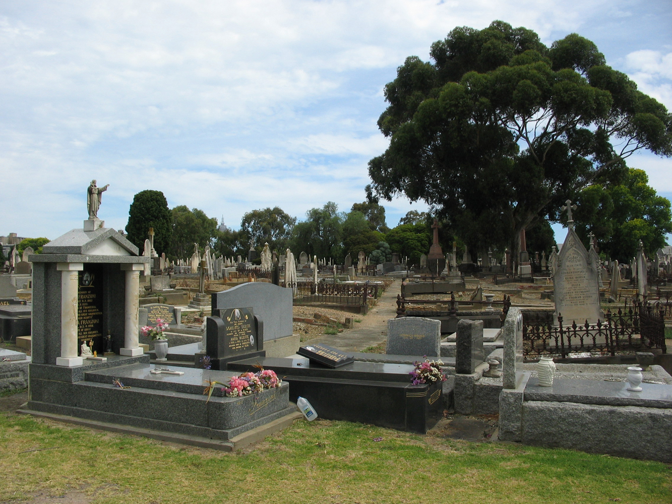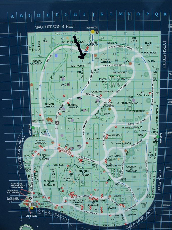 | To find the tombstone of Ellen McNamara and Mary Madigan. Go in through the main entrance (you can drive your car in) and go straight ahead. Walter Lindrums grave is on the right about a 100 metres in. Go along North Rd in the cemetery and then turn left down 7 th Avenue. As you come around the gentle bend and eventually turn east you will see the Dandenong's straight ahead. This is the Catholic section and the grave is to your right – check the photos for your bearings. The office at the front gate will also give you particulars. |