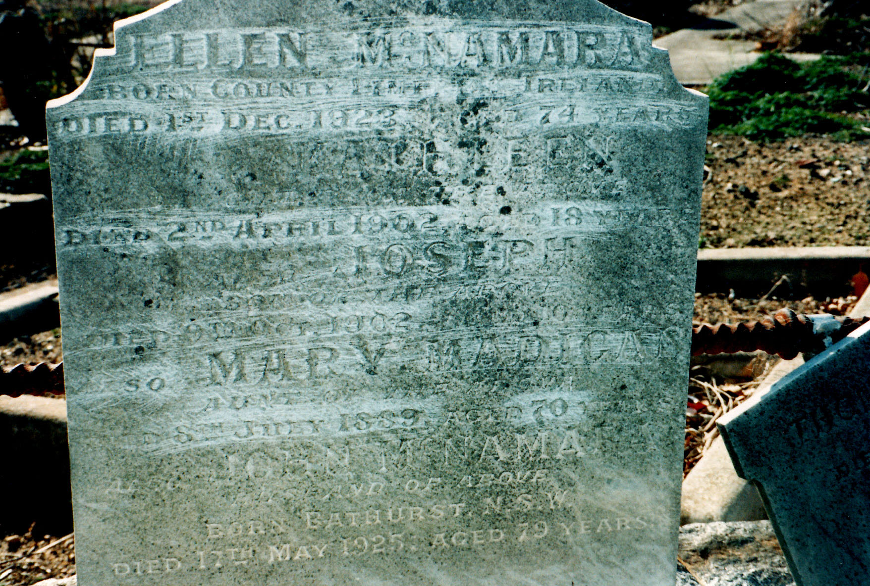 In Loving Memory Of (PICTURE OF A SHAMROCK) ELLEN McNAMARA BORN CO. LIMERICK IRELAND DIED 1 st Dec 1923 AGED 74 YEARS ALSO KATHLEEN DAUGHTER OF THE ABOVE DIED 2 nd APRIL 1902 AGED 18 YEARS ALSO JOSEPH SON OF THE ABOVE DIED 9 th OCTOBER 1902 AGED 10 ALSO MARY MADIGAN AUNT OF THE ABOVE DIED 8 th JULY 1889 AGED 70 YEARS ALSO JOHN McNAMARA HUSBAND OF THE ABOVE BORN BATHURST N.S.W. DIED 17 th MAY 1928 AGED 79 YEARS (And a small tombstone to the side of the main tombstone) ALSO THOMAS PATRICK SON OF THE ABOVE DIED 8 th MARCH 1936 AGED 60 YEARS R.I.P. |