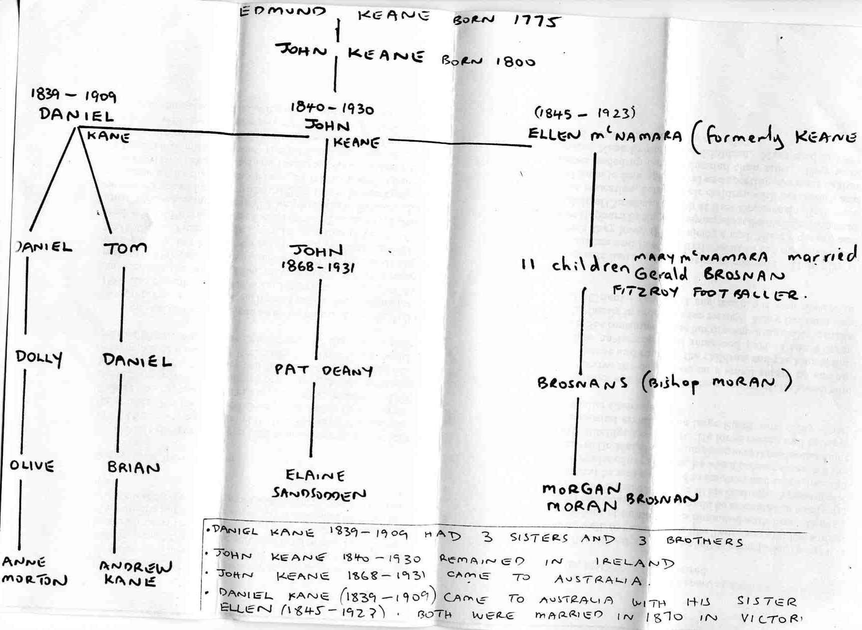 Ellen Keane (McNamara) was called “Mackie”. She was a quiet religious lady and people remember the black shawl she always wore. Ellen had 11 children and the offspring were McNamara, Brosnam, Moran (later one became a Bishop), Morgan, Kelly. The eldest was called John, then Margaret, Thomas, Mary, Nell, Daniel, Michael, Kathleen, Annie, Hannah and Joseph. Notice how the same names keep coming up. Ellen could sign her name on the marriage certificate but her husband John could not sign his name. Dolly Kane was in contact with the McNamara family. DOLLY Kane had told me that ELLEN MCNAMARA (KANE) was our Great grand fathers sister and this was confirmed with death certificate. DOLLY STAYED WITH THE BROSNAN'S OFTEN AND RECEIVED CARDS FROM THEM (Brosnans were the descendants of Ellen Mc Namara.) Gerald Brosnan captained Fitzroy and played in 3 Grand Finals loosing one by 2 points and winning the other two (1903-1905) http://en.wikipedia.org/wiki/Gerald_Brosnan Fr. Brosnan who attended Ronald Ryan at his hanging could well be a relative.