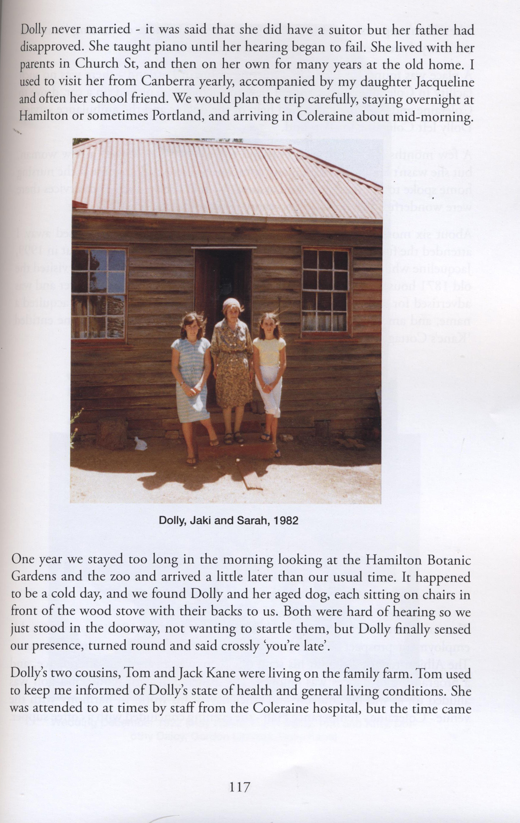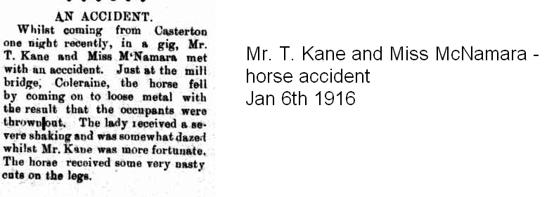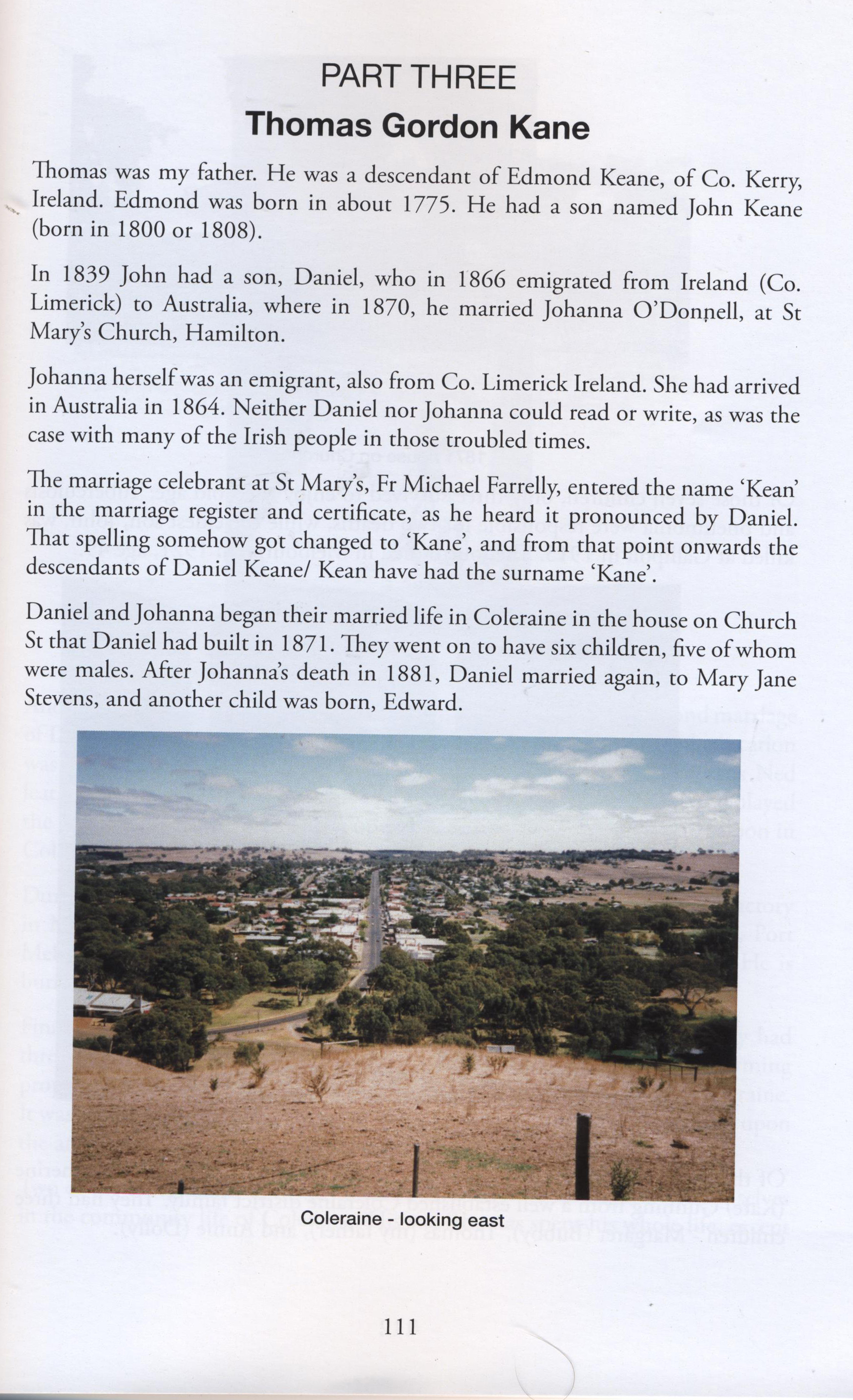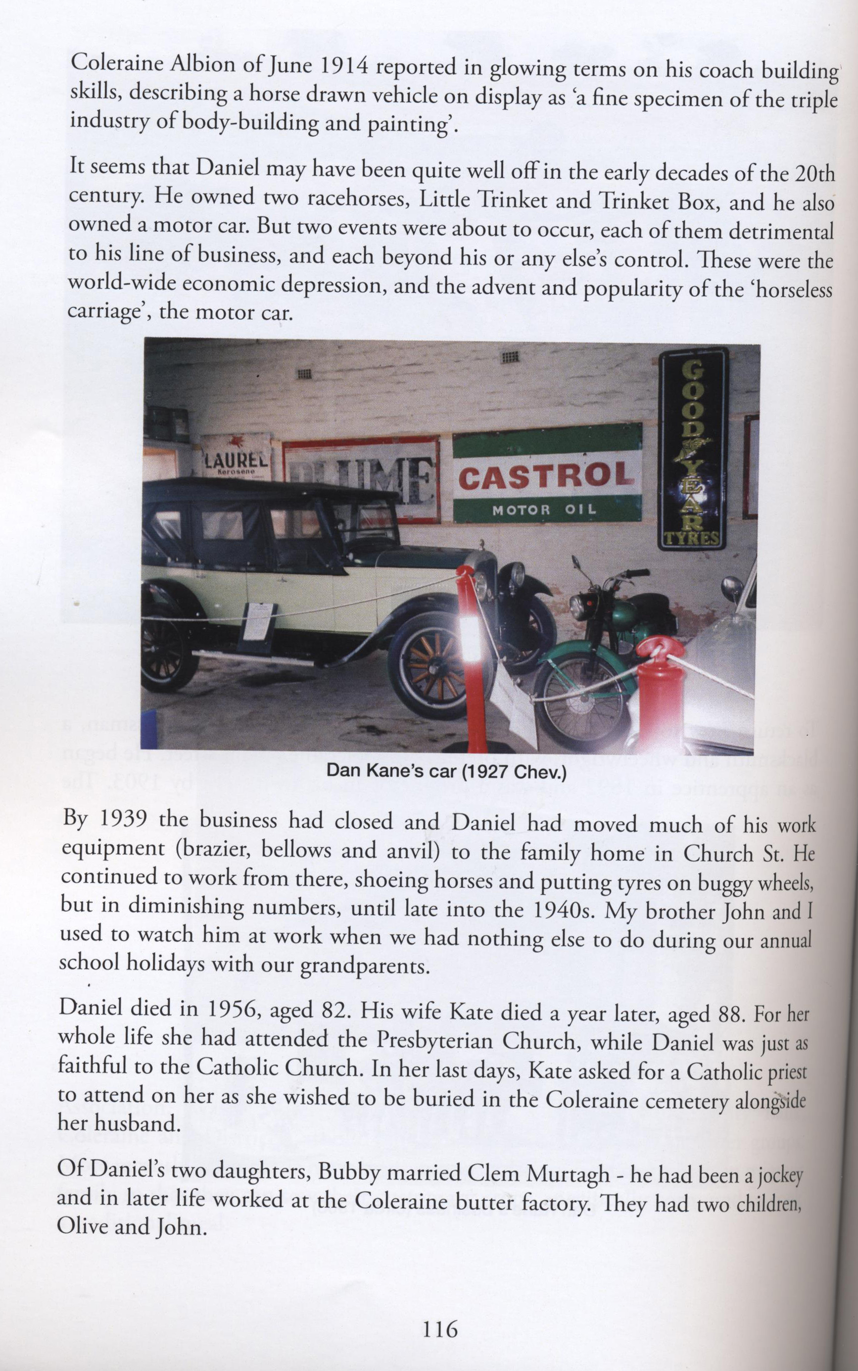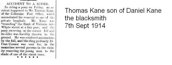 Dolly gave him a hard time: wouldn't let him lie on the bed, made him take his boots off. Dolly was a seamstress. Daniel Kane had a crook back but dolly would not let him lie on the bed during the day. Daniel Kane (blacksmith) used to go down the road to Nan an Gran Brown for a talk often. 1903 Daniel Snr farmer, Daniel Jnr labourer, James labourer, John labourer and Thomas labourer all lived together at Salt Pans Road. They were on the Electoral Rolls in Coleraine. In 1905 living at the large weather board house on Salt Pans Rd were Daniel Snr (farmer), John, James, Margaret, Patrick and Thomas. (Daniel Junior was a blacksmith in Coleraine). All voted in that year in Coleraine. 1906 Daniel (Snr) farmer, James (labourer), John (labourer), Patrick (labourer), Thomas (labourer) Salt Pans Rd, Daniel (blacksmith) and Catherine Kane Coleraine all voted in Coleraine. 1908 Daniel (Snr) farmer, James (labourer), John (labourer), Patrick (labourer), Thomas (labourer), Edward (labourer) and Margaret (home duties) Salt Pans Rd, Daniel (blacksmith) and Catherine Kane Coleraine all voted in Coleraine. In the short space of 18 years the Kane family of 8 members residing at Salt Pans Rd in a large weatherboard house was reduced to 3 (Tom, Daniel and Ned). Daniel 1909 aged 70,Patrick 1909 age 28, John 1915 aged 41, James 1921 aged 47 and Margaret 1927 aged 51.