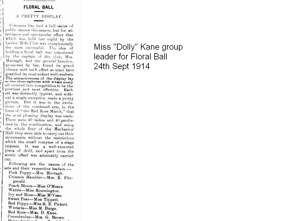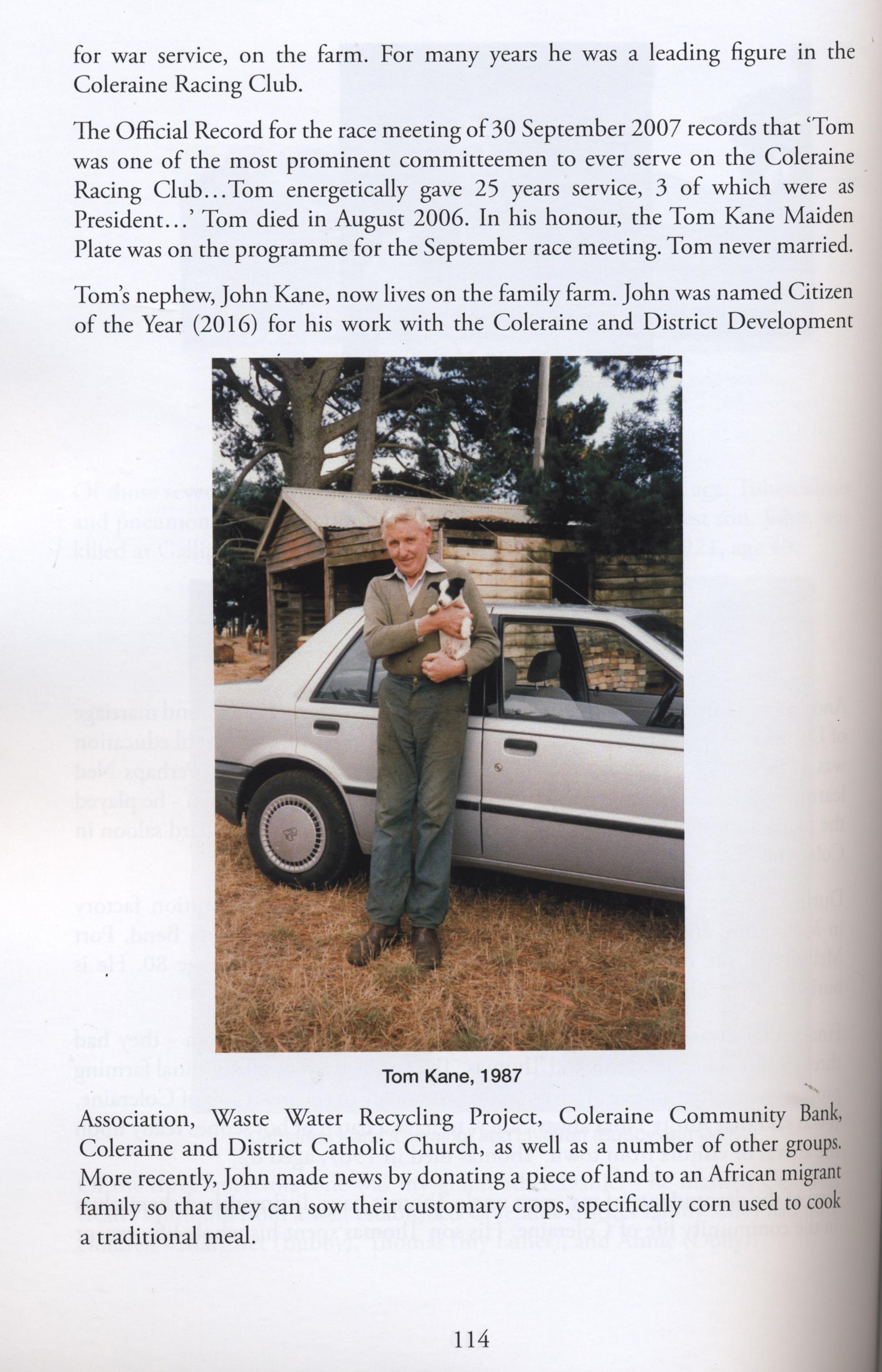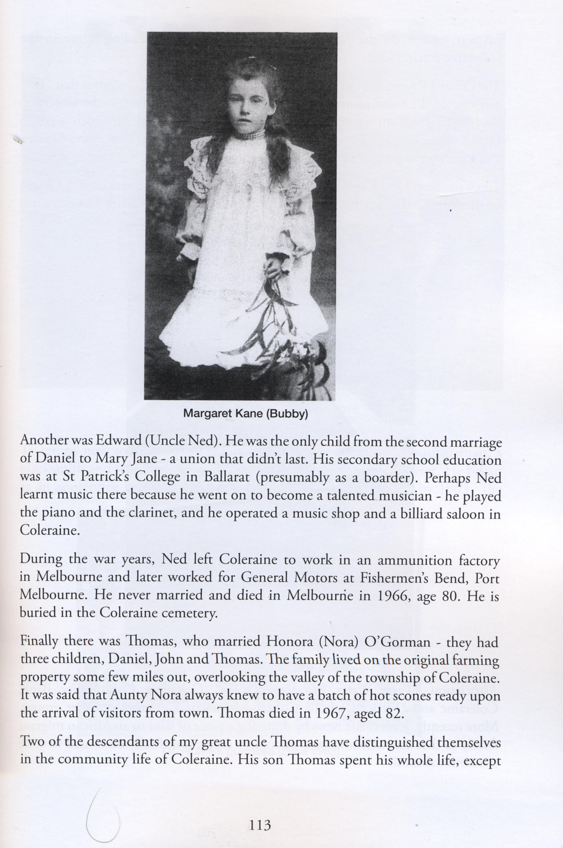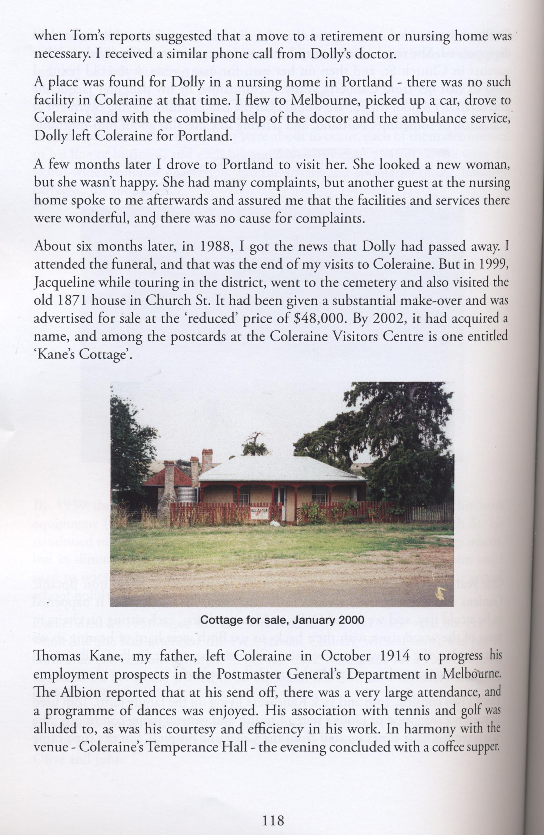 Dolly gave him a hard time: wouldn't let him lie on the bed, made him take his boots off. Dolly was a seamstress. Daniel Kane had a crook back but dolly would not let him lie on the bed during the day. Daniel Kane (blacksmith) used to go down the road to Nan an Gran Brown for a talk often. 1903 Daniel Snr farmer, Daniel Jnr labourer, James labourer, John labourer and Thomas labourer all lived together at Salt Pans Road. They were on the Electoral Rolls in Coleraine. In 1905 living at the large weather board house on Salt Pans Rd were Daniel Snr (farmer), John, James, Margaret, Patrick and Thomas. (Daniel Junior was a blacksmith in Coleraine). All voted in that year in Coleraine. 1906 Daniel (Snr) farmer, James (labourer), John (labourer), Patrick (labourer), Thomas (labourer) Salt Pans Rd, Daniel (blacksmith) and Catherine Kane Coleraine all voted in Coleraine. 1908 Daniel (Snr) farmer, James (labourer), John (labourer), Patrick (labourer), Thomas (labourer), Edward (labourer) and Margaret (home duties) Salt Pans Rd, Daniel (blacksmith) and Catherine Kane Coleraine all voted in Coleraine. In the short space of 18 years the Kane family of 8 members residing at Salt Pans Rd in a large weatherboard house was reduced to 3 (Tom, Daniel and Ned). Daniel 1909 aged 70,Patrick 1909 age 28, John 1915 aged 41, James 1921 aged 47 and Margaret 1927 aged 51.