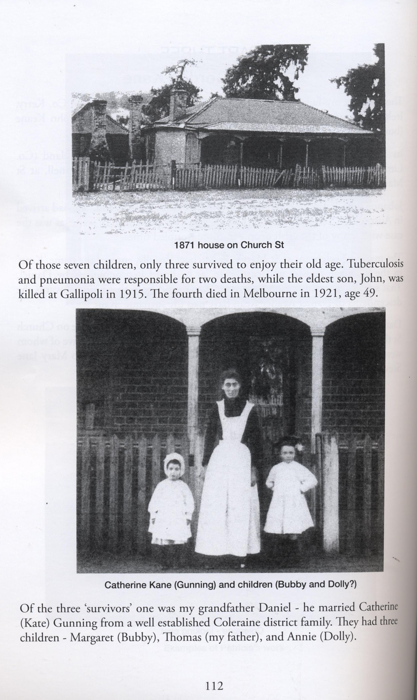 Daniel Kane probably came to Coleraine because Johanna O’Donnell’s brother T. O’Donnell had taken up the present property in Church St. where Dolly later lived in August 1862. Daniel Kane then bought it from him in 1870. Also, Johanna had a brother Patrick who was at the wedding in 1870. I PRESUME THE FIRST HOUSE WHICH YOU CAN SEE FACING EAST WAS BUILT IN 1862 AND DANIEL KANE BUILT THE HOUSE FACING SOUTH IN 1870