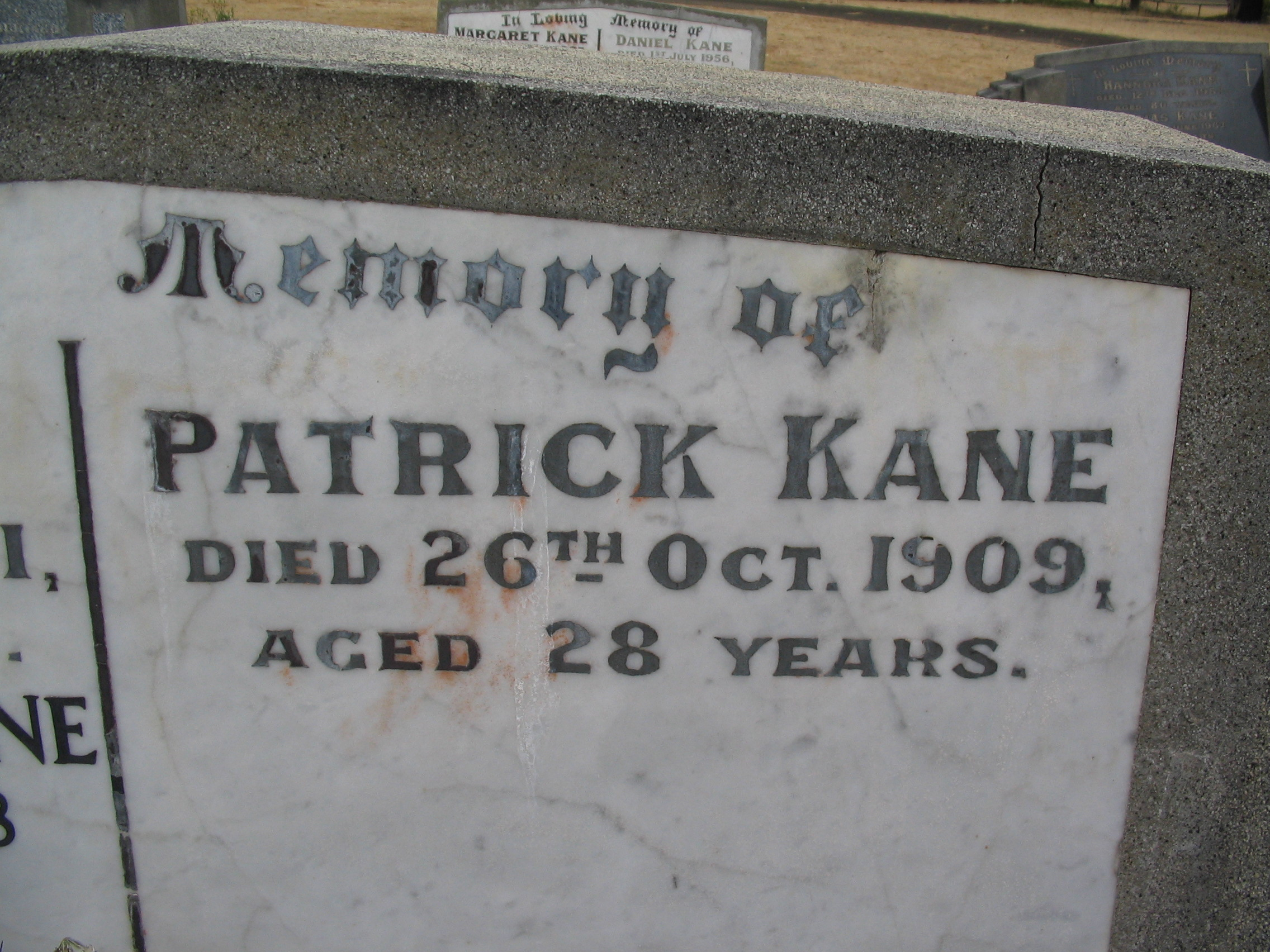 Yesterday morning an old family of the district suffered a reduction of its members when Patrick, 5th son of Mr. Daniel Kane, of Salt Pans Rd. succumbed to a complaint (T.B.) from which he had suffered for a considerable time. Early in the year Mr. Patrick Kane spent 3 months in a sanatorium during which time he showed improvement. Those who knew him easily recognized the traces of the invalid. Last Thursday he was in Coleraine and called on his brother Daniel, remarking on leaving that he might call again on Saturday if he felt well enough. He passed away 3:00 Sunday morning