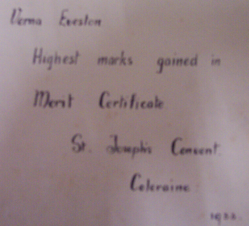 | Teachers: Sister Teresa, Sister Elaine Ryan - mums favourite - taught her in the merit year. She was different than the others and a great teacher. (audio) When she left everone was heartbroken. Mum wrote to her for years. (audio) Mum was awarded a book presented from Upters store. Presented to Verna Eveston - highest marks gained in Merit Certificate at St. Joseph's Convent Coleraine 1933. | |||