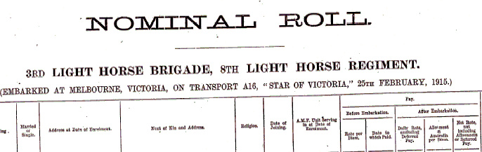 John joined the newly formed 8th Light Horse Regiment which was "formed at Broadmeadows camp on 23rd September 1914 as the 6th Light Horse Regiment firstly. But a reorganisation of the rapidly expanding AIF in early October resulted in the 6th being renumbered the 8th, and it became part of the 3rd Light Horse Brigade. "