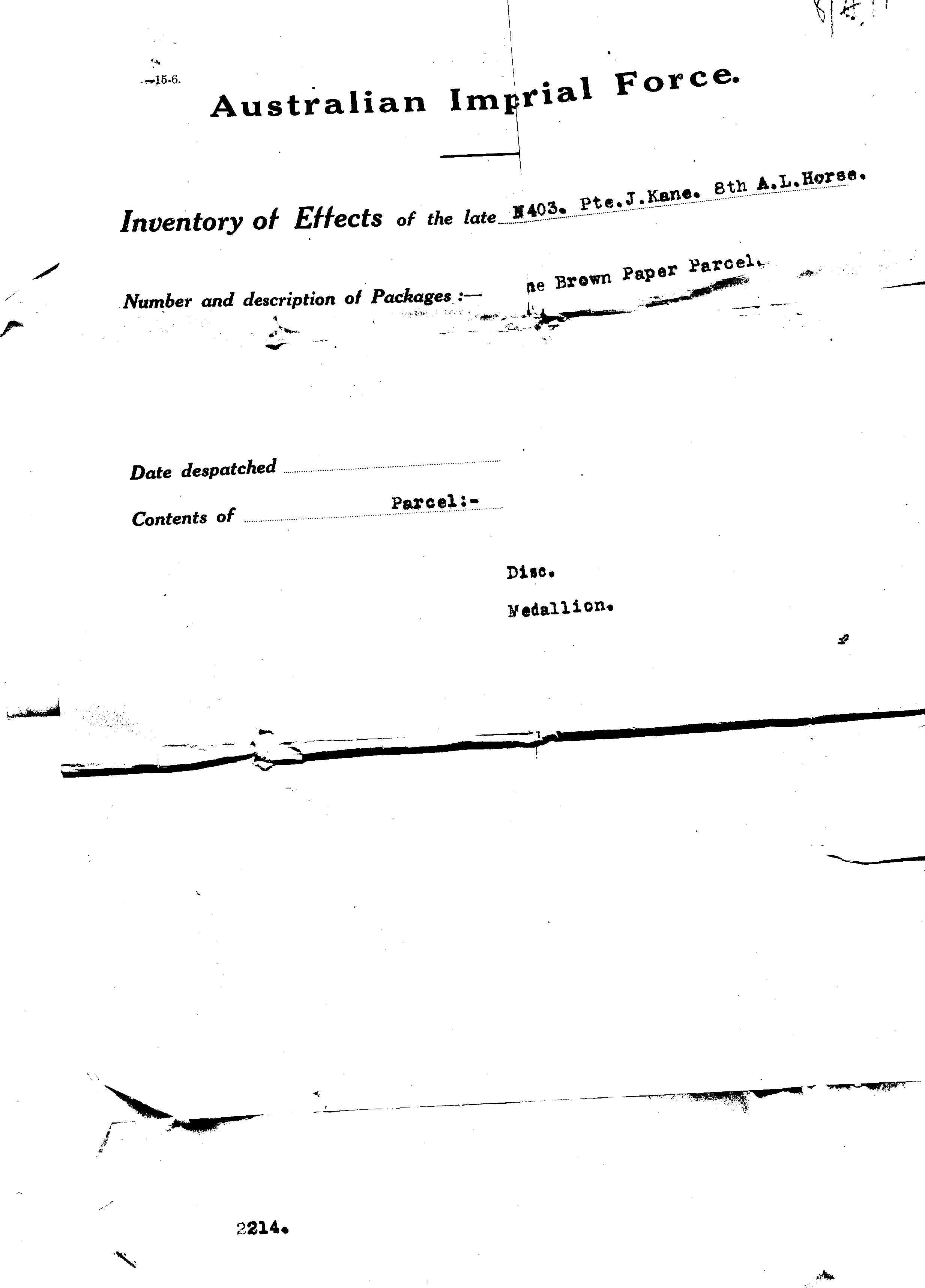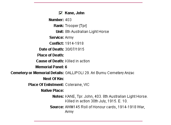 Outbreak of war enlistment history of Gallipoli Ballie's view why Gallipoli John Kane enlistment Broadmeadows John Kane 27th October 1914 John Kane 6th November 1914 Melbourne Cup 402,403,404 Nulan Port Melbourne John Kane 3rd March 1915 Cairo John Kane April 15th 1915 Cairo April 25 landing Leigh Ridgeway's Diary Gallipoli slang John Kane 14th June Walker's Ridge Walking tour 8th Light horse landing 30th July 1915 Ari Burnu The Nek R.T.A. Medals Gallipoli: then and now The last eyewitness interview Links Book on the 8th Light Horse HEIRLOOMS OF JOHN KANE