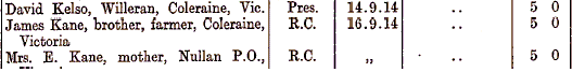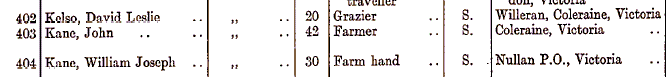 He was the eldest son and worked as a farmer, contractor in and around Coleraine building bridges etc (like his father) and also as a horse trainer. The day he left the Coleraine Railway Station on the steam train for Melbourne he must have known there was a good chance he would not return because he was crying. Mrs Harrip 1993 remembers Bubby (Kane) Murtagh saying goodbye to John Kane at the Railway Station. She remembers him crying which was unusual for a man at that time.
