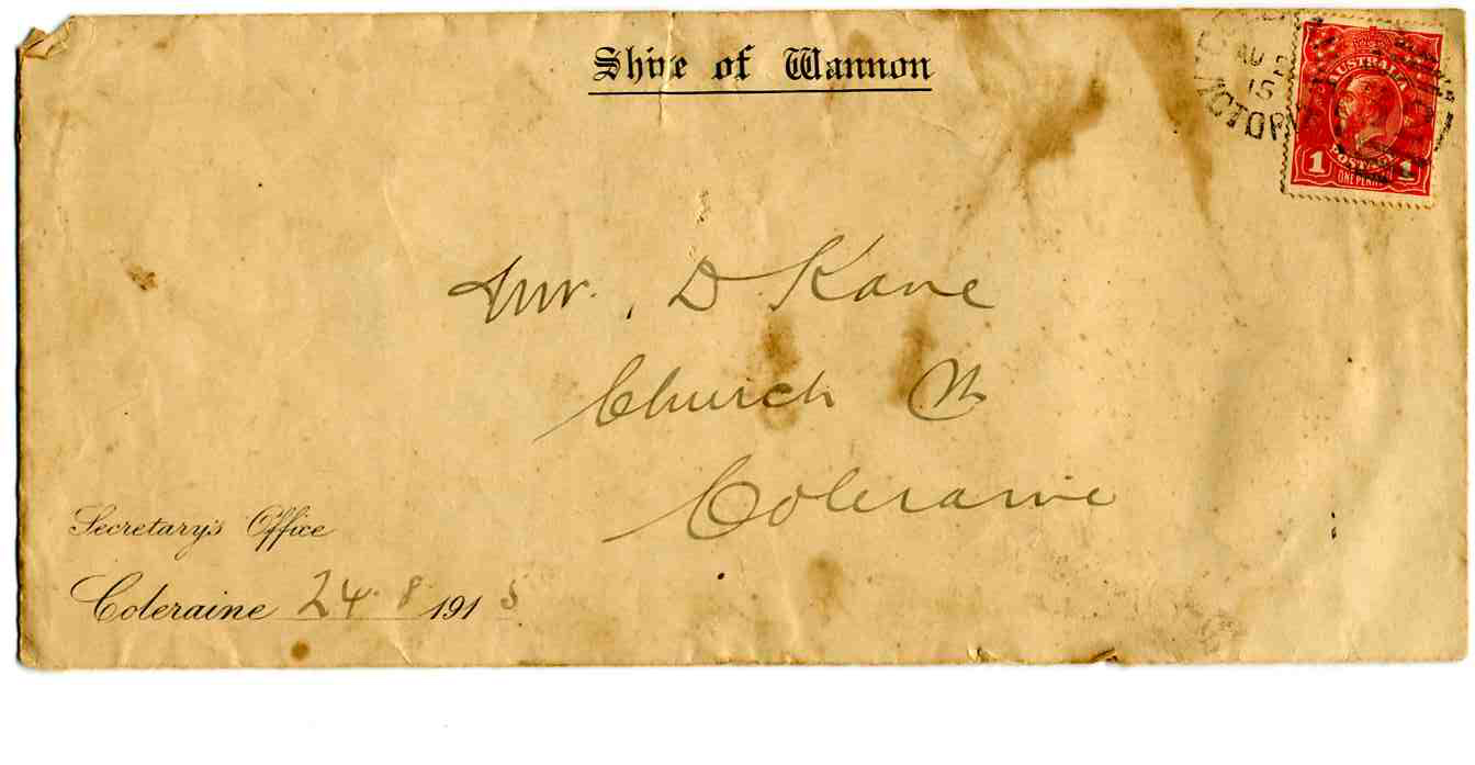 "A few lines to know how you are all getting on up there. I have been going to write this last fortnight but I kept putting it off. You know how I hate writing but I heard all the news from there. Jo Younger is writing to all Coleraine I think. They have great fun with him running after letters. Well Mag we are getting a solid doing here from six till five. It's left right left and double up. We are getting our uniforms next week. I will send you a photo when I get it taken. We got the hats now. Young Tom was out on Sunday; he looks thin. Charlie Mc Kebery was out one night last week. He enjoyed it. There is good fun here for a new comer but it soon gets stale. The Maroneys (lived near the dam at Paddy Moyles) were here one Sunday and brought me a bonza cake. It was a ....? from Paddy Heenan. (lived near the Wannon River). They wanted me to go in for a weekend but I did not go. I have not been out of camp since I came here. I can get a week country leave any time now. I might be up for the show. If not, the week after. I'll send you word. If you see Dot Braitwaite (Melbourne friends of the Kanes) , tell her there are a lot of Minyip boys here. Well Mag the first contingent are all gone. There was a great weeping? here last Saturday week the night before they went. The camp was crowded with their friends. We were all very lonely when they were going. They reckon we will be leaving the first week in December. A long time to put in yet. Henry is a great infantry soldier now. I see Mick (Mahoney?) sometimes. They are camped from us. We are the leading Light Horse regiment here now. Eric Gardiner (returned soldier) is full of it. He will soon ........ it I think. I suppose Jimmy is finished shearing now. I see crossbred wool is bringing a good price now. It must be bad up there now (dry?) How is Tom getting on for water? Well Mag it is dark and getting near the end of the paper. Remember me to Jim, Tom and Ned. I hope you are all well. Be sure and write soon. "