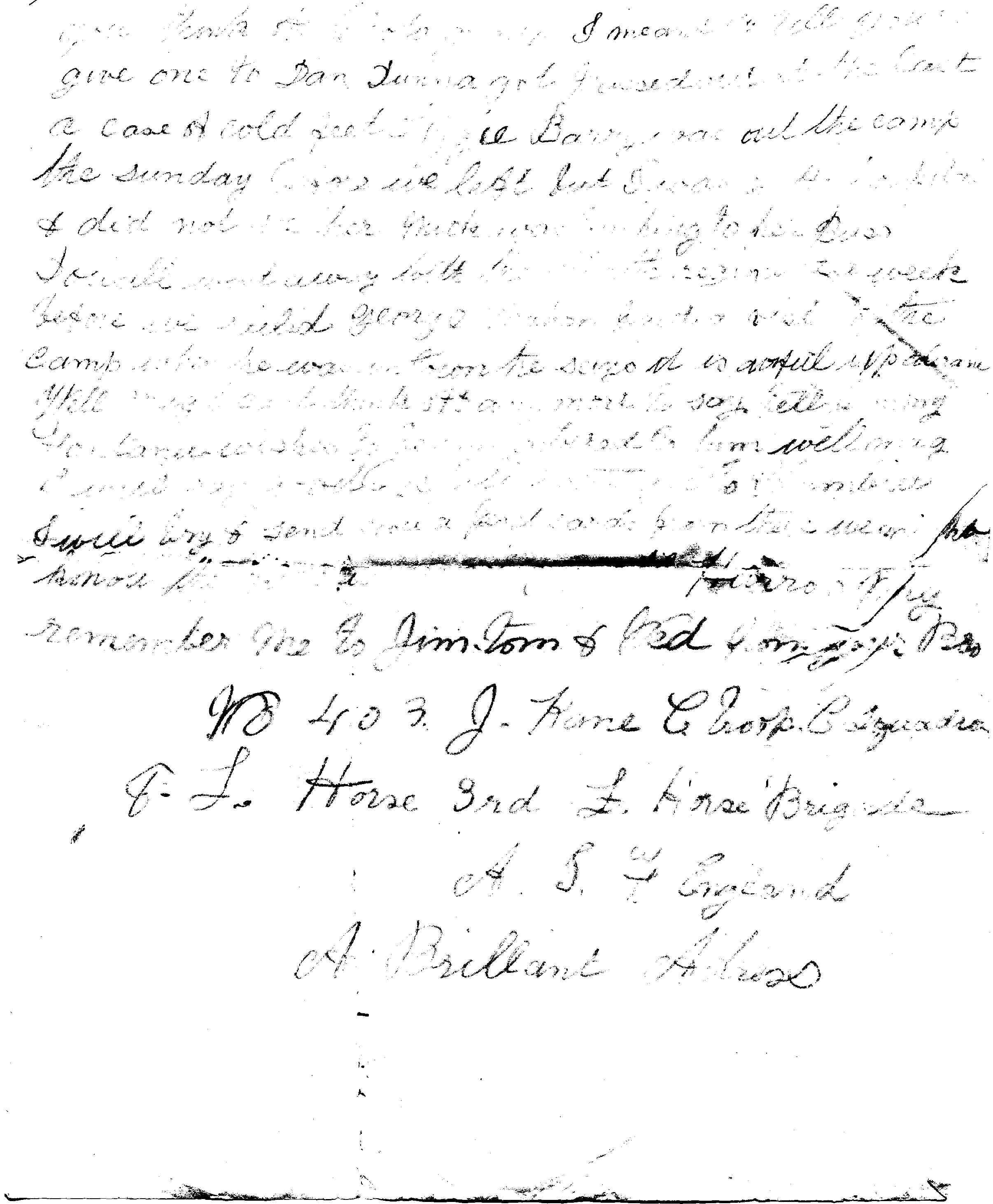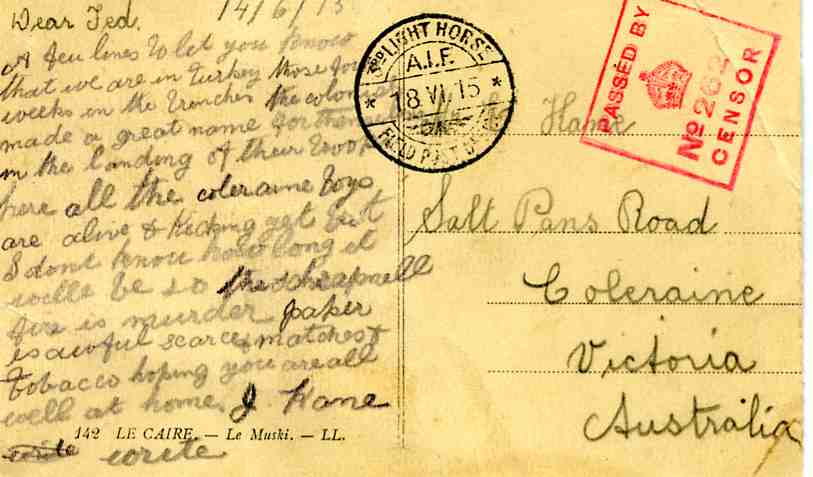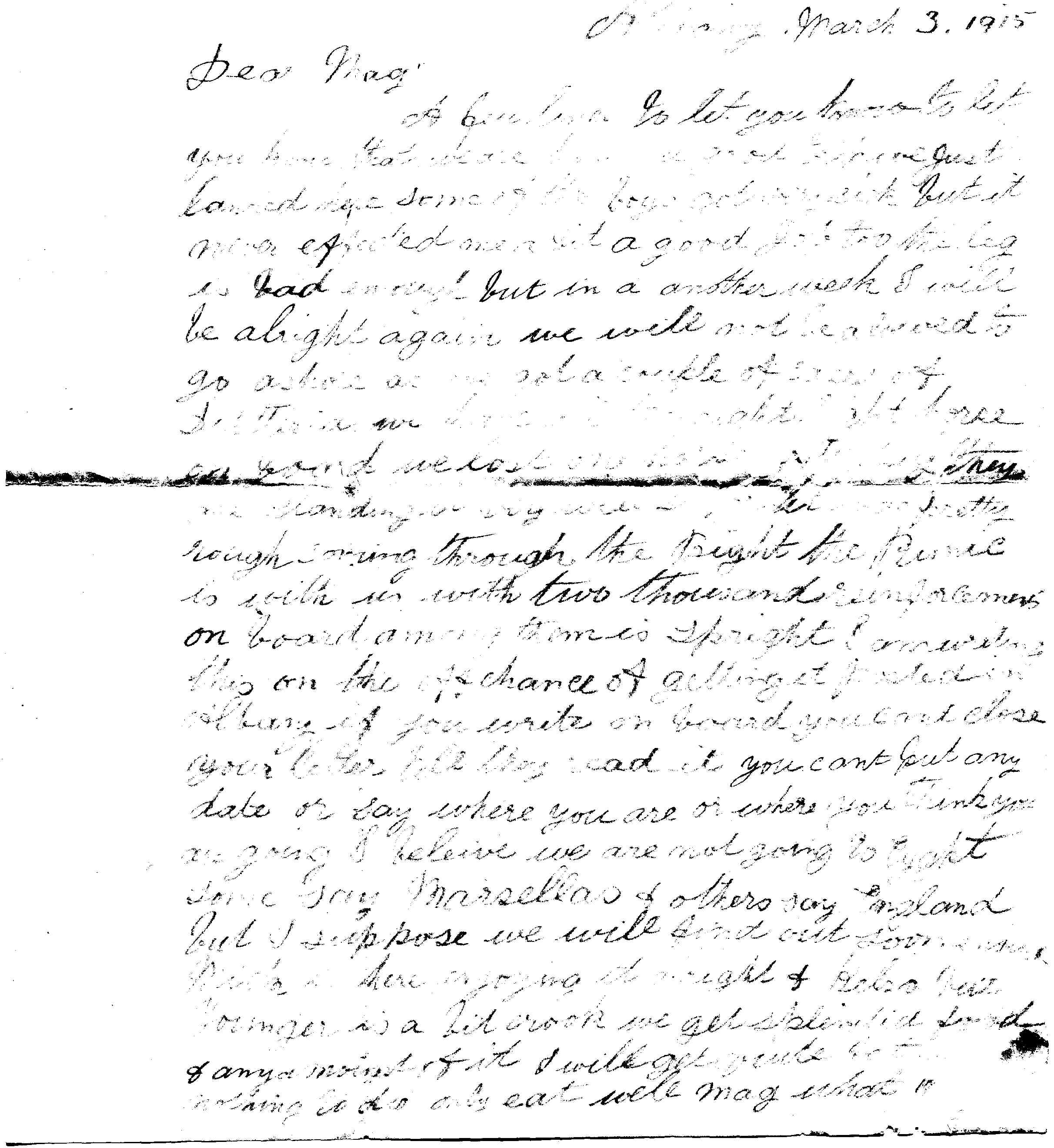 "A few lines to let you know that we are having a good trip. We just landed here. Some of the boys got very sick but it never effected me a bit. A good job too. The leg is bad enough, but in another week I'll be alright again. We will not be allowed to go ashore as we got a couple of cases of diptheria. We have all the eight light horse on board. We lost one horse yesterday. They are standing it very well so far. It was pretty rough coming through the Bight. The r.... is with us with 2000 reinforcements on board. Among them is Sright (McMahon). I am writing this on the off chance of getting it posted in Albany. If you write on board you can't close your letter like they read it. You can't put any date or say where you are or where you think you are going. I believe we are going to Egypt. Some say Marsellas and others say England but I suppose we will find out soon enough. Mick is here enjoying it alright and Kelso ...... Younger is a bit crook. We get splendid food and any amount of it. I will get quite fat. Nothing to do only. Well Mag what do you think of the group photo. I meant to tell you to give one to Dan Tunna got passed out at the last. A case of cold feet. Lizzie Barry was out the camp the Sunday before we left but I was in the hospital and did not see her. Mick was talking to her. Buso Douall went away with the (9th) regiment a week before we sailed. George Mahon paid a visit when he was in town he said it's awful up at Coleraine. (Severe drought). Well Mag I can't think of anymore to say. Tell Jimmie Fontana wishes to be remembered to him. Well Mag, I will say goodbye till we get to Columbia. I will try and send a post card from there. We might know then where we are going. Hurroo Mag. Remember me to Jim, Tom and Ned from your Bro.