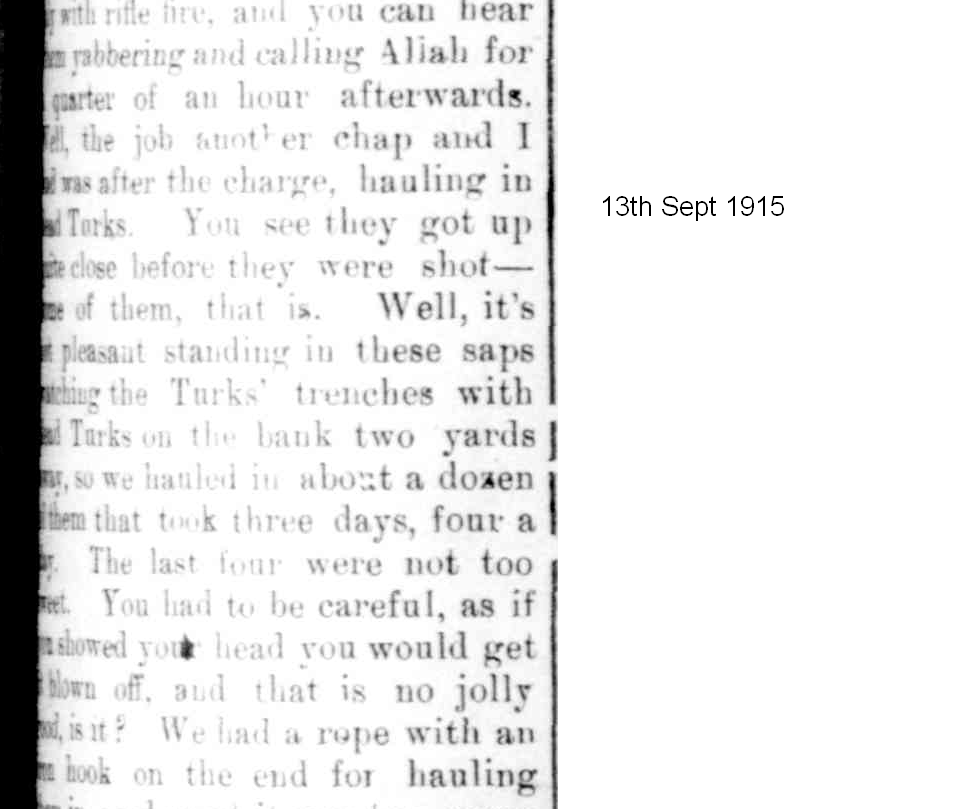 May 29th – “The Anzacs and the Turks threw bombs and grenades into each other’s trenches. For an hour and half it was hell itself, you could hear yourself speak. The brave ambulance men were doing their noble work bringing in the wounded.