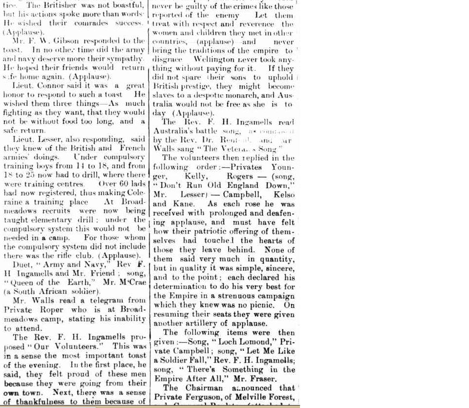 "Two weeks and one day after the outbreak of the first world war the Australian Army established the Broadmeadows Military Camp in the open area between Broadmeadows and Campbellfield. Reticulated water was connected in five days, a project which the shire had been unable to persuade the Board of Works to undertake in seven years of negotiation. The camp and the surrounding areas were the venue of numerous bivouacs and military exercises."