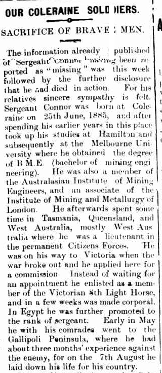 Corporal John Leslie CONNOR, a 29?? year old Mining Engineer from Coleraine, Victoria. He enlisted on 7 November 1914; and subsequently was Killed in Action, 7 August 1915.