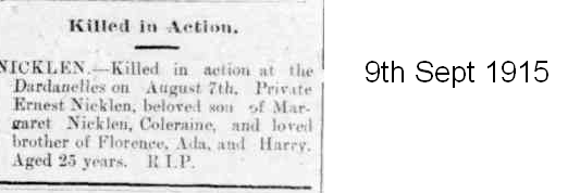 7 th August: Trooper Ernest Nicklin 25 yrs. Reinforced the 5 th Batt. at Gallipoli 9 th July at Shrapnel Gully. Died 7 th August. Buried at Shrapnel Gully Cemetry.