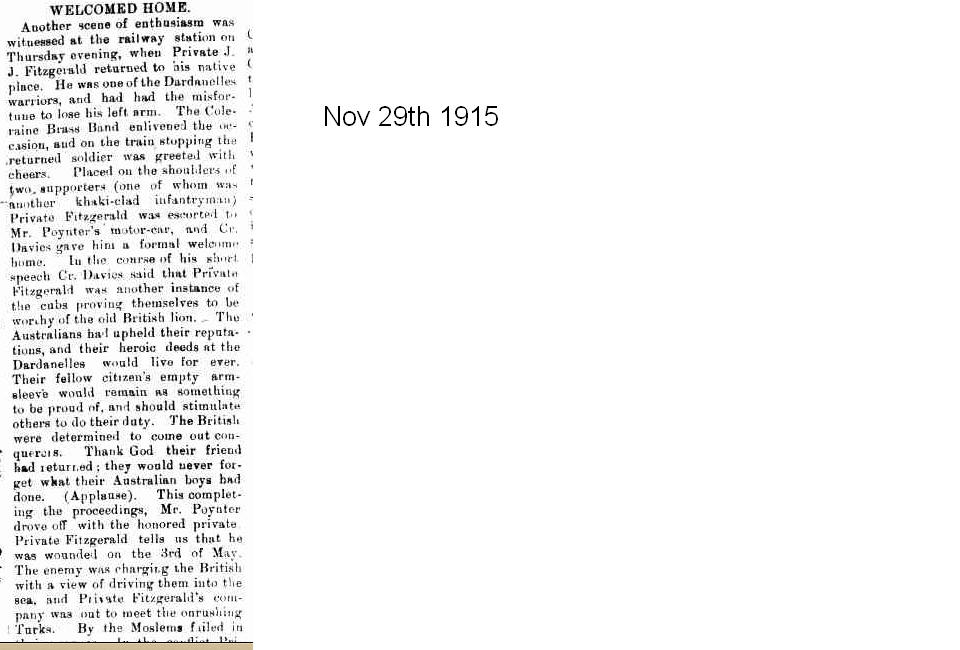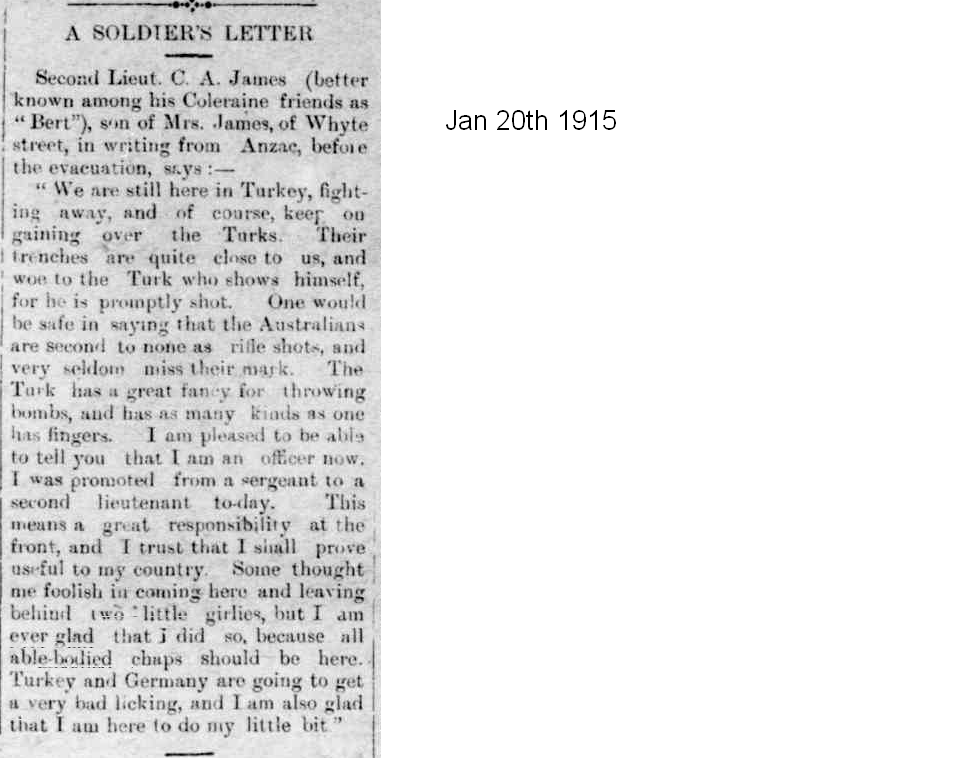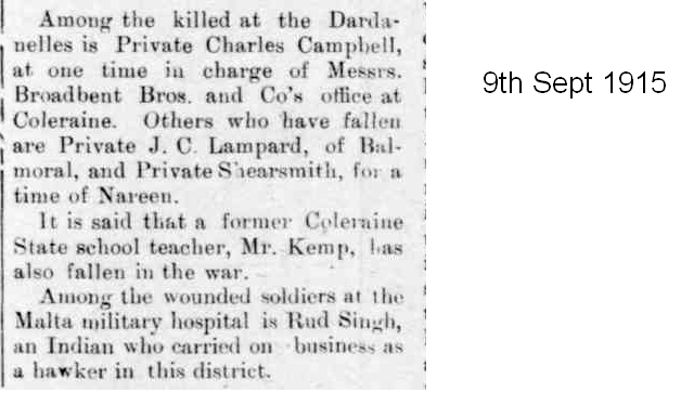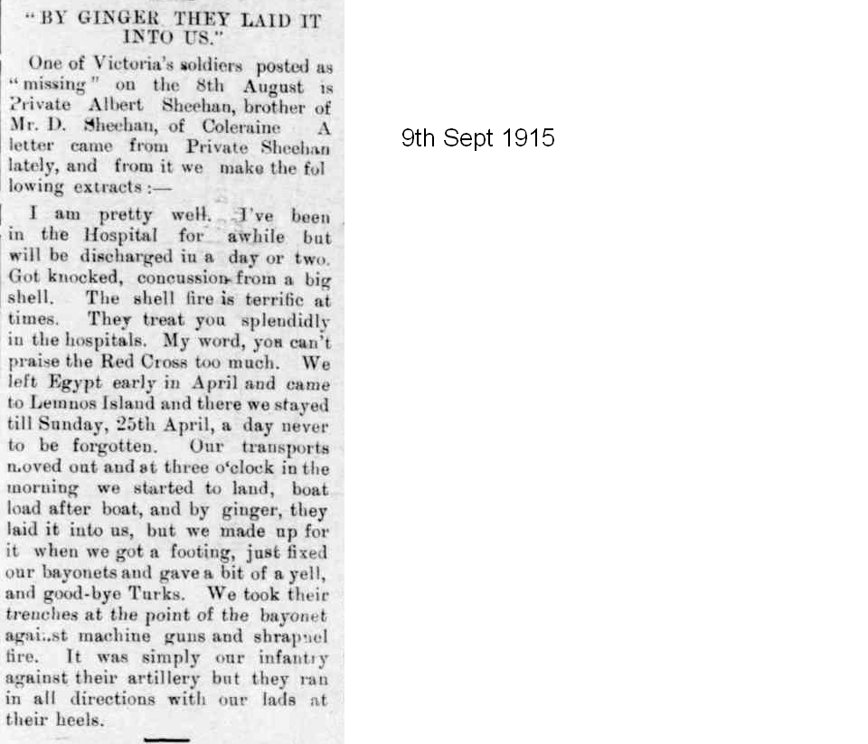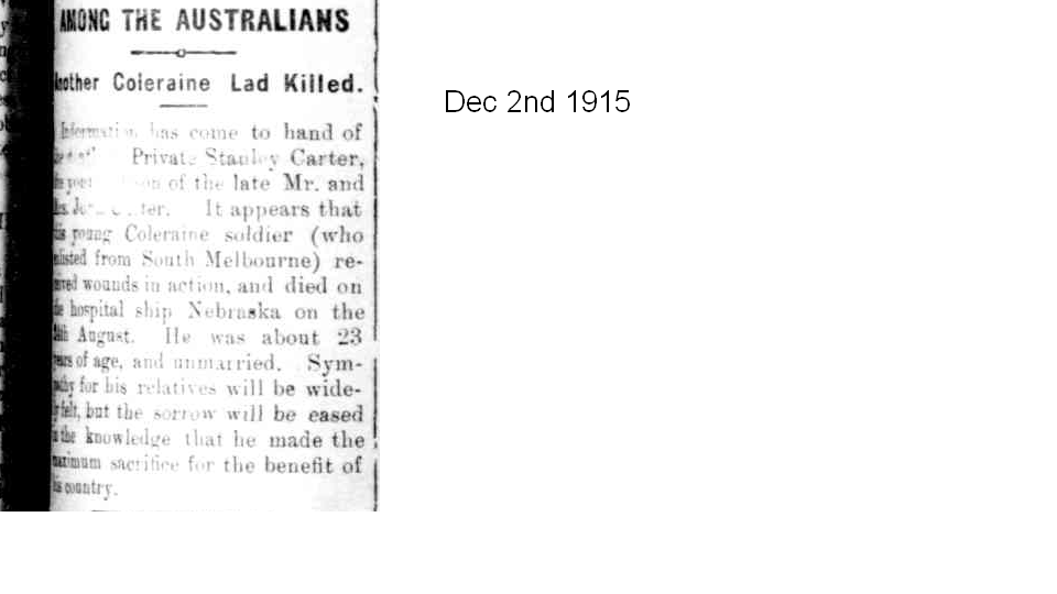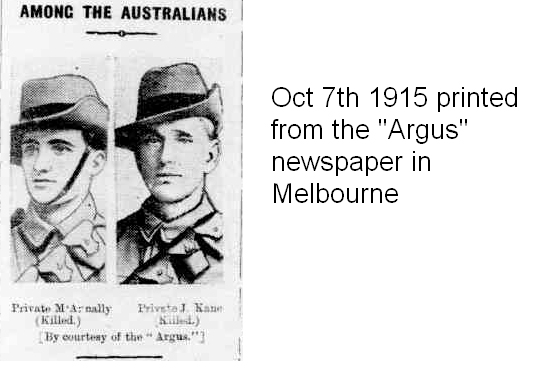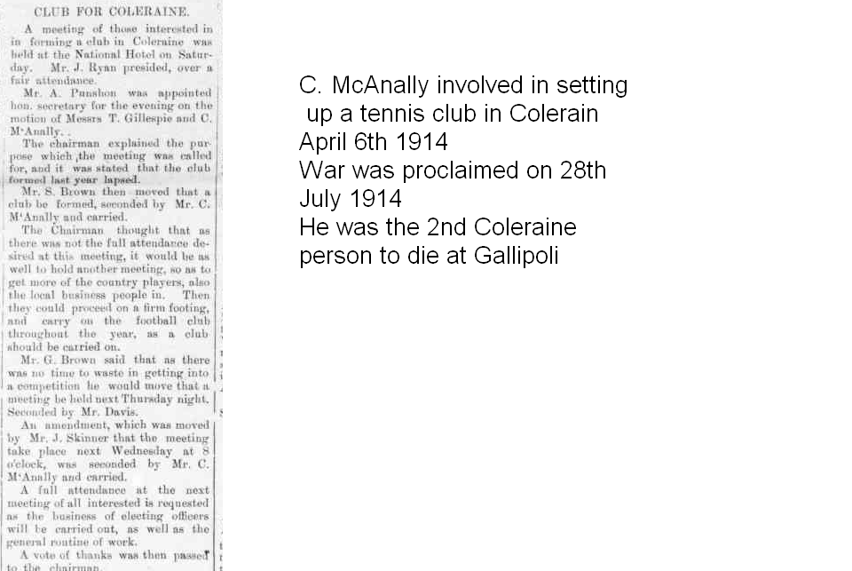 7 th August: Trooper Charles McAnally 26 years. 8 th Light Horse. K.I.A. at Walkers Ridge Gallipoli. Commemorated Lone Pine Memorial. The four McAnally sons died as a result of the War – 2 in France and one in Coleraine as a result of war injuries 1919.