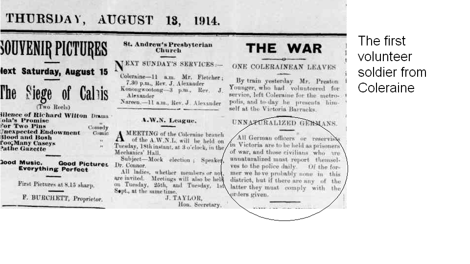 #480 Preston Maitland Younger, aged 23, stock dealer, Coleraine, brother of W. Broughton in Hamilton. He returned to Coleraine after the war and his wife was a friend of Norah Kane (Grandma Kane). Preston was involved in the setting up the Soldier Settlements in the local area. (source: Ballie June 2004). He was wounded at Gallipoli on 7th August 1915. |