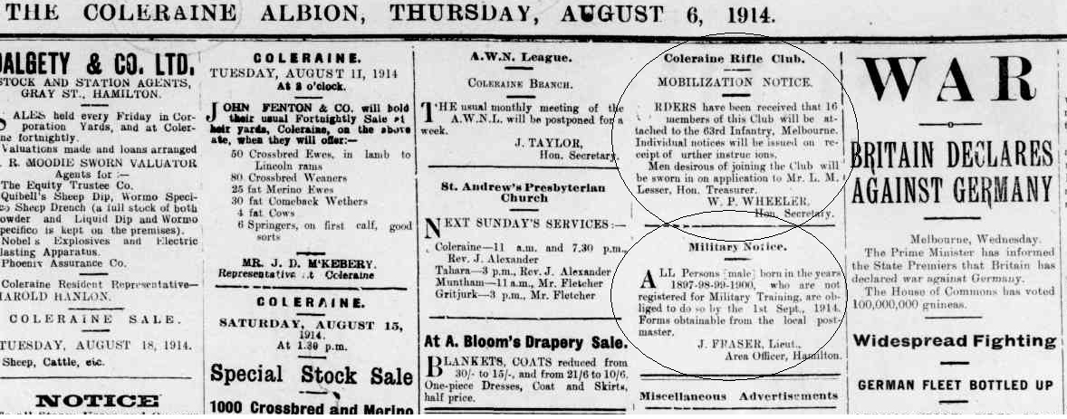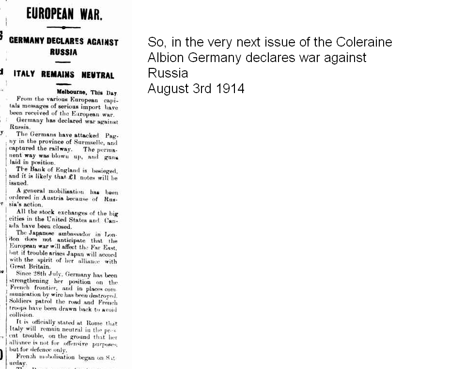 When War was declared there was an enthusiastic meeting in the Mechanics Hall in August 1914. The meeting was chaired by Mr. J. Trangmar and there was a variety of guest speakers. Preston Younger was the first volunteer to sign up. (He did return after the War). Unlike most who signed up in World War 1 who were in their late teens or early twenties, John Kane was 43 years old when he enlisted on 1st September 1914 in Coleraine and signed up on 16th September in Coleraine.
