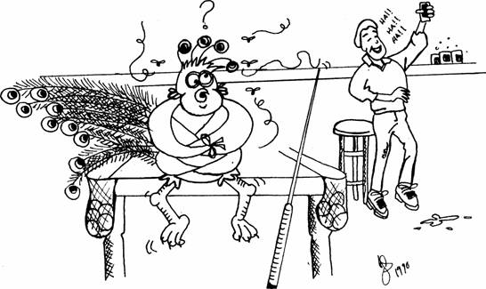 His cousin takes a deep breath. He leans over the table, aims carefully and shoots. The cue ball is moving slowly towards the black. It seems to take forever to get there. Finally, it hits the black sending it right into the top corner pocket, and the cue ball stops short. The game is over! But there is no jumping or shouting for joy. No, both cousins join at the bar once again to have a quiet round of winning drinks together, quite happy to know that they have knocked the proud peacock off his perch.