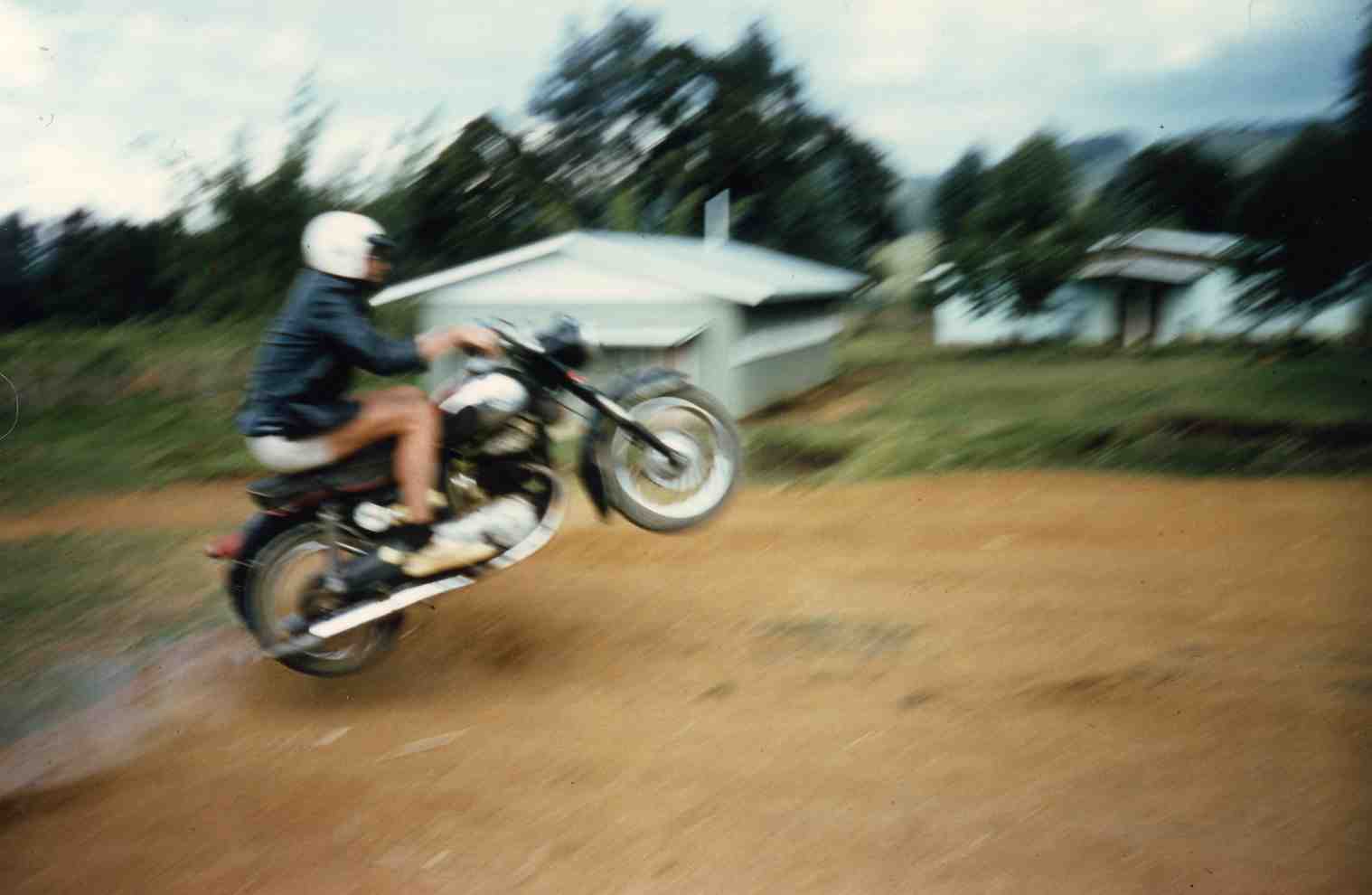 Perhaps the most potentially hazardous accident happened in the College grounds one Sunday afternoon. The roar of our motorbikes had drawn a large group of school kids referred to by the locals as ‘pikininis’. Alan had spied a large mound of fresh land fill and thought it would be a great idea to scoot up the slope and drop down on the other side. There were four of us clowning around as we were joined by John the carpenter on this occasion. He was from central Victoria and was a wild character to look at. He came from Ned Kelly country and I’m sure he would have fitted in well with his gang. His hair was long and unruly and his eyes peered out from behind a massive black beard. We did endless circuits and each leap into the air with our bikes brought adoring yells from the kids. We became more and more daring and Alan in particular was in his element flying up the now well formed ramp, rising high above the take off area and landing on the back tyre. I then decided to throw caution to the wind so I opened the throttle up on the runway and headed for my moment of glory. I hit the target and rose impressively into the air but then the scene started to turn nasty. As I was airborne the bike kept revolving and I knew that if I didn’t think up something quick it would crash down on top of me. In a instant I decided to abort my stunt but to my horror, two of my fingers were jammed in the brake cable. There was only one thing to do - yank as hard as I could. This worked and I found myself tumbling clear of the bike. As I rose to my feet the kids were going crazy with delight but I noticed that I had torn my fingers down to the bone. Bravely, or stupidly I closed my hand up, started the bike up again and headed off for one last circuit. Of course, my last effort was tokenly half-hearted as I desperately tried to hide my injury and show that I was not hurt. I then raised my clenched fist in a good bye gesture to the adoring crowd and headed for home. My mates sensed that I was not OK and followed the ‘tale tail’ blood trail to where my bike was parked. I quickly owned up that I was in a bad way and I was shuttled off to the hospital for stitches.