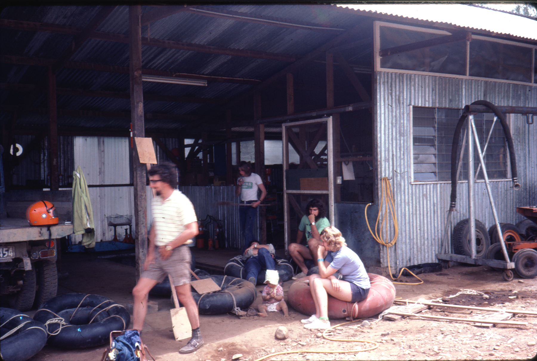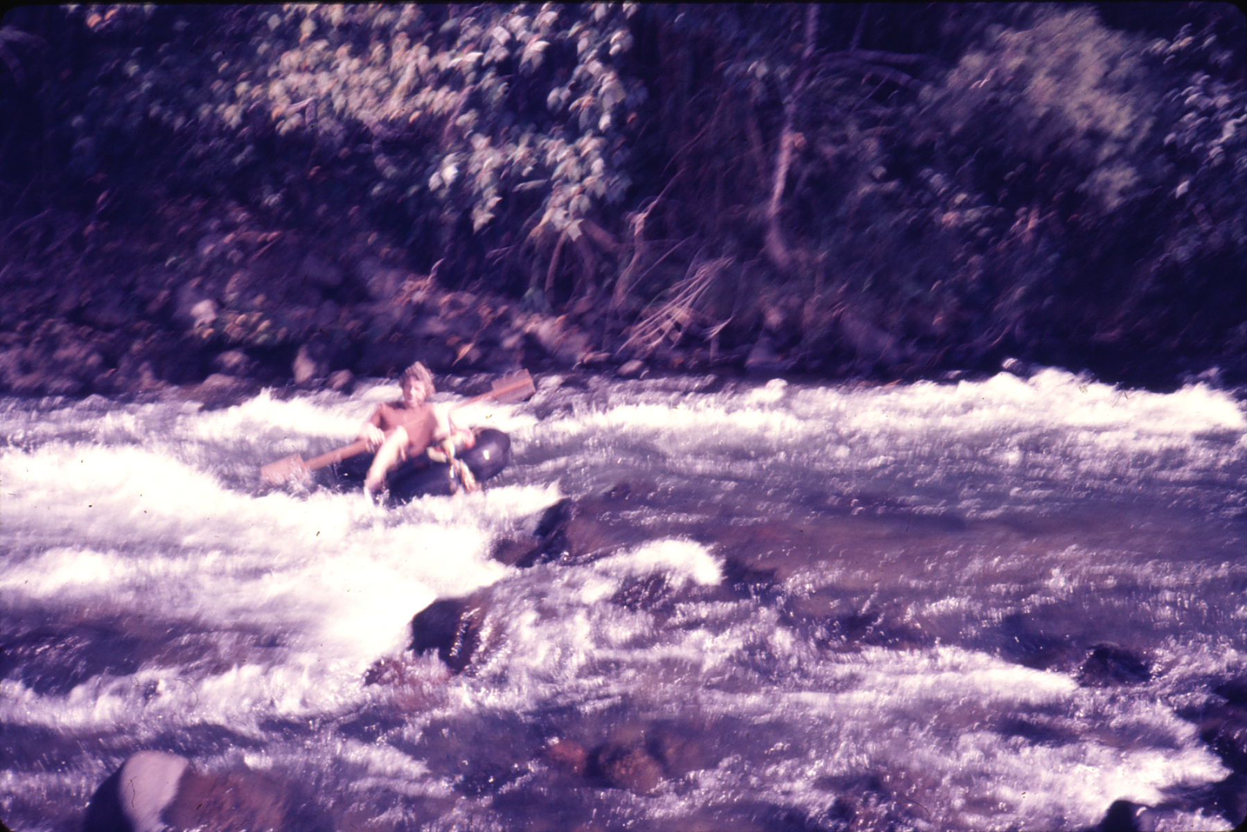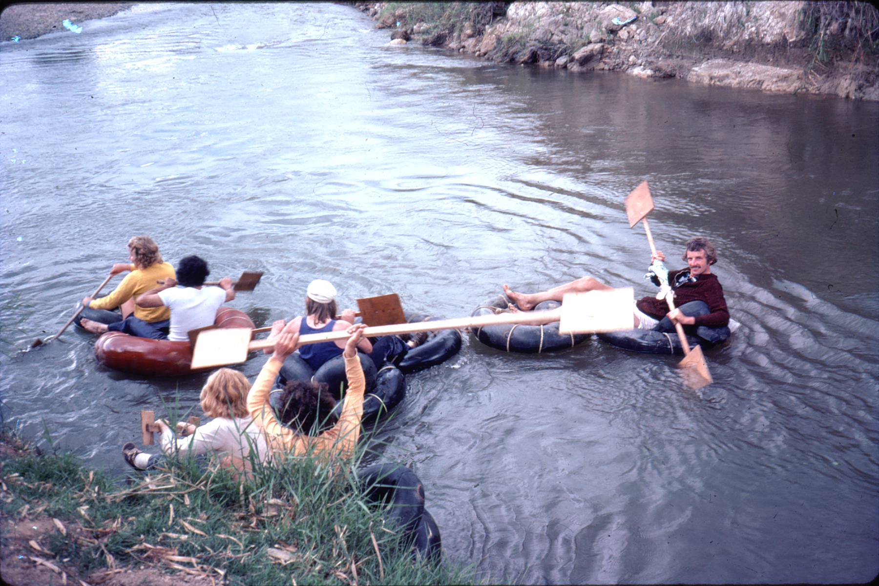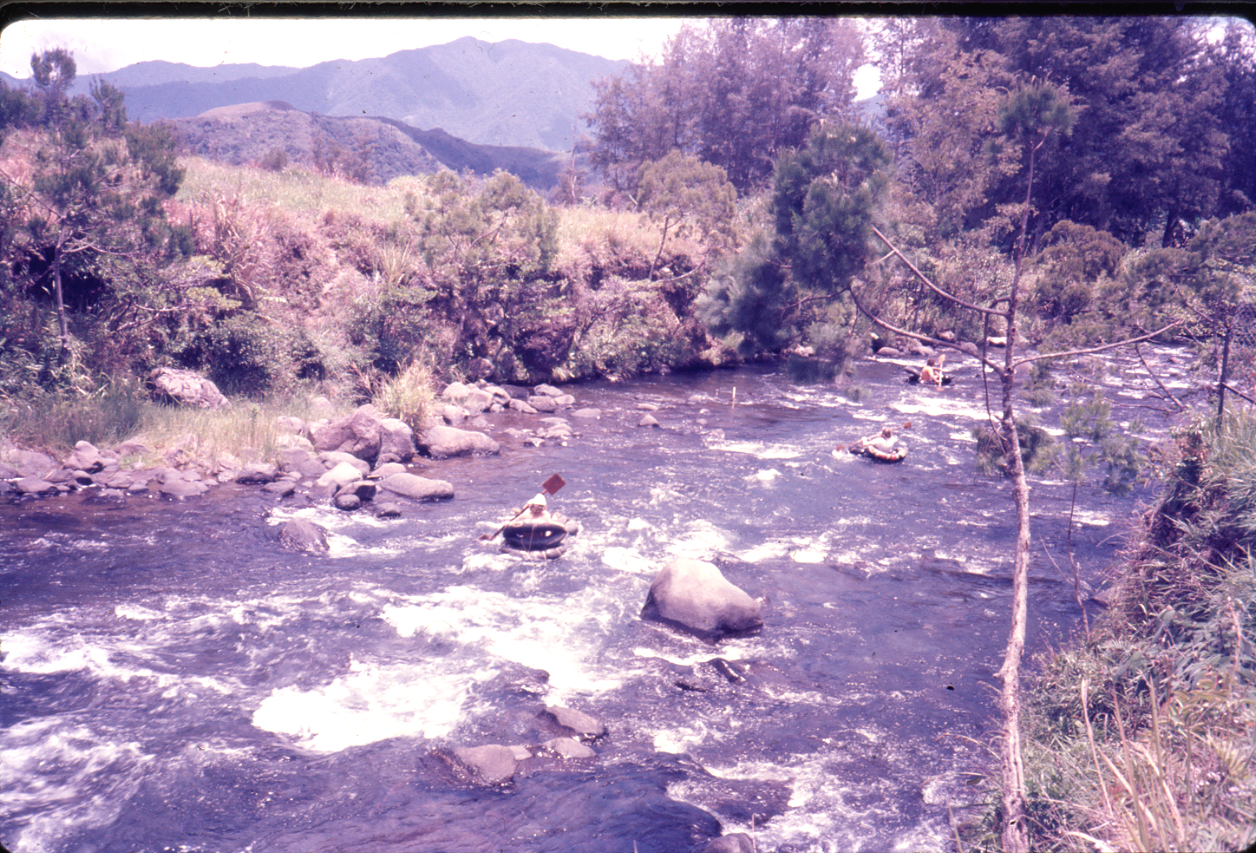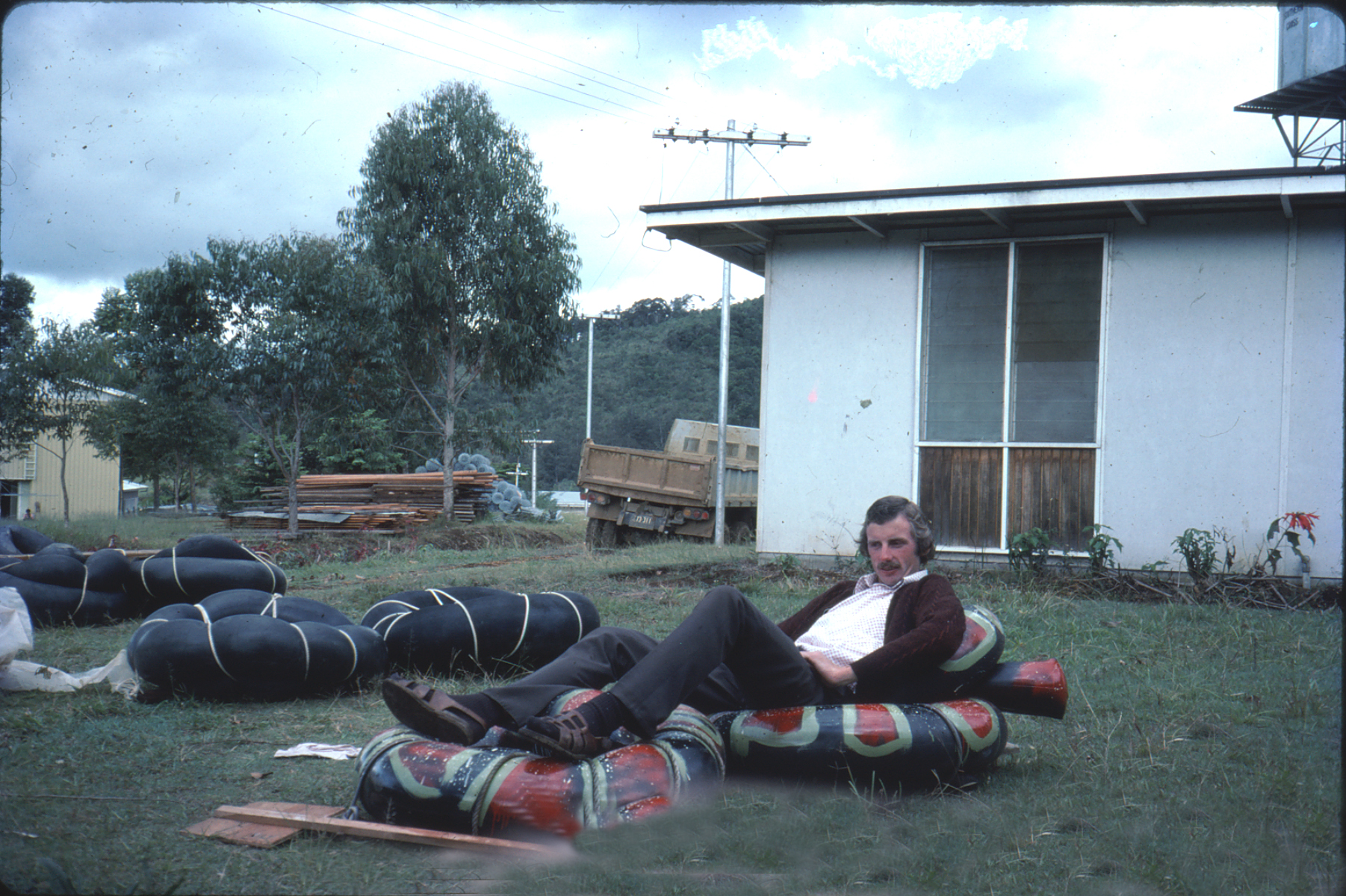 While we worked hard at the College, we couldn’t wait for the weekend to roll around. Whether it was going to a ‘sing sing’ to witness the culture of the people out in the bush, travelling to the Bayer River sanctuary to see birds of Paradise or sitting with the locals in the picture theatre to watch a Western. Life seemed to be one great adventure and Alan was always thinking up new ideas such as the ‘gummy race’. ‘Gummy’ is the pigeon word for rubber tyre, and the plan was to construct rafts to float on the Waghi River. There was an abundance of old tyres in the workshop and so we set about making designs that would withstand 10 miles of fast flowing water. “H” frames had been tried previously but Alan assured us that the best design was a single board drilled with a series of well spaced holes that the tyres could be latched to with rope. We put a double layer of tubes for a back rest and finally painted our masterpieces ready for the ‘Apex gummy dash’. Alan was a member of Apex and he thought this would be a good way to raise money.